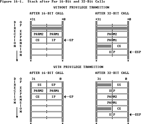 When adding 32-bit gates to 16-bit procedures, it is important to consider the number of parameters. The count field of the gate descriptor specifies the size of the parameter string to copy from the current stack to the stack of the more privileged procedure. The count field of a 16-bit gate specifies the number of words to be copied, whereas the count field of a 32-bit gate specifies the number of doublewords to be copied; therefore, the 16-bit procedure must use an even number of words as parameters.